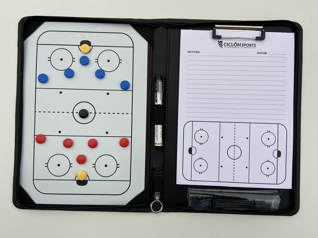 - Clip met daaronder een A4 notitieblok om notities van een oefening, training of wedstrijd te kunnen maken. Op het notitieblok is een hockeyveld afgebeeld met daarboven voldoende ruimte voor aantekeningen.