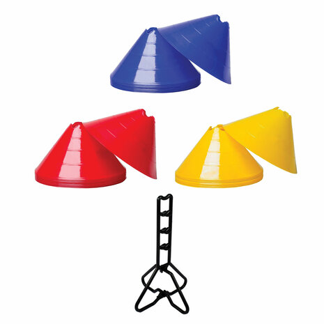 Op zoek naar grote markeerschijven om te gebruiken bij de trainingen? Bij ons kun je deze set van grote markeerschijven kopen voor de beste prijs uit Nederland en België. Deze set bestaat uit 30 grote markeerschijven met een hoogte van 15 cm. De set bestaat uit tien stuks rode, gele en blauwe trainingshoedjes die geleverd worden met een stevige pionhouder. Hiermee kun je de pionnen eenvoudig opbergen en meenemen naar jouw trainingen en workouts.